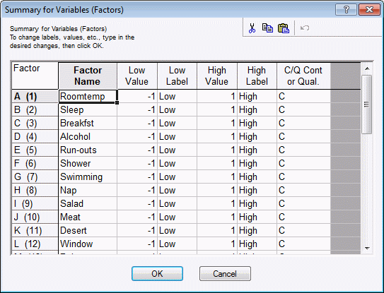 The first thing to do is to specify the factor names and settings. Click the Change factor names, values, etc. button, and enter the factor names for this experiment (we will accept the default values, that is, the ±1 codes).