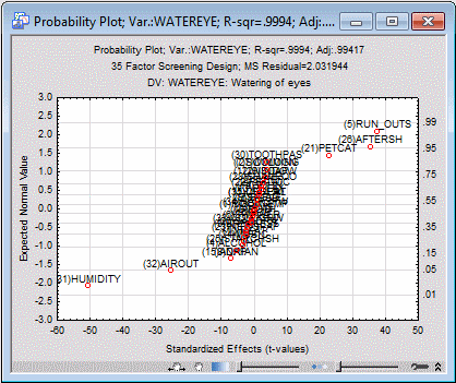 Select the ANOVA/Effects tab. Select the Label points in normal plot check box, select the second dependent variable in the Variable box (Watereye), and click the Normal probability plot button.