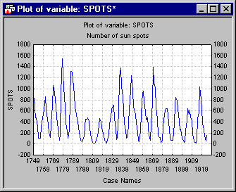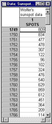 File Sunspot.sta contains part of the famous Wolfer sunspot numbers for the years 1749 through 1924 (Anderson, 1971). Open this data file via the File - Open Examples menu; it is in the Datasets folder. Shown below is a listing of the first few cases in the example file.