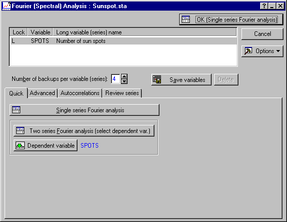 Select Time Series/Forecasting from the Statistics - Advanced Linear/Nonlinear Models menu to display the Time Series Analysis Startup Panel. Note that since the data file Sunspot.sta is currently open and Spots is the only variable in that data file, Spots will automatically be selected in the Time Series Analysis dialog. Now, click the Spectral (Fourier) analysis button to display the Fourier (Spectral) Analysis dialog.