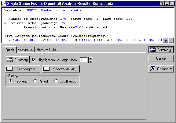 The summary box at the top of the dialog shows some summary statistics for the series. It also shows the five largest periodogram peaks (by frequency). The largest three peaks are at .0852, .0909, and .0114. This information is often useful when analyzing very long series (e.g., with over 100,000 observations) that cannot readily be summarized in a single plot. In this case, however, the periodogram values can easily be reviewed; click the Periodogram button on the Quick tab.