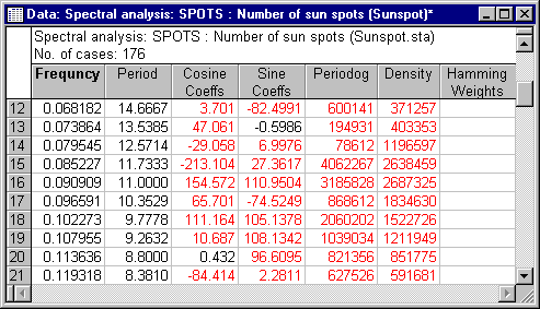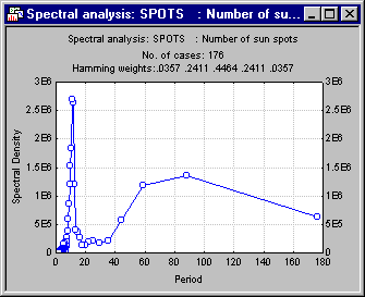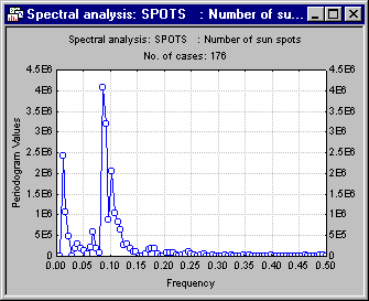As discussed in the Introductory Overview, the Frequency is the number of cycles per unit time (where each observation is treated as one unit of time). Thus, the Frequency of 0.0909 corresponds to a Period (the number of units of time necessary to complete one full cycle) of 11. Since the sunspot data in Sunspot.sta represent annual observations, you can conclude that there is a strong 11-year (perhaps a little longer than 11-year) cycle in sunspot activity.