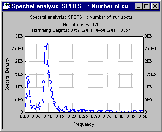 It is customary to smooth the periodogram -- so as to remove random fluctuations -- in order to obtain spectral density estimates. The type of weighted moving average and the window width can be selected in the Data windows for spectral density estimates box on the Single Series Fourier (Spectral) Analysis Results dialog - Advanced tab. The Introductory Overview discusses these options in detail. For this example, accept the default window (5-point Hamming window) and click the Spectral density button on the Review & plot tab.