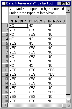 This example is based on a (fictitious) data set reported in Siegel and Castellan (1988, page 173). Suppose that you are interested in investigating the effect of interviewing style on the number of respondents who agree to answer personal questions in face-to-face surveys. For example, it is always most difficult to get responses concerning personal finances or health in this type of survey, and you might want to learn whether interviewing style improves the response rate (non-refusals) to such personal questions. For that purpose, you could train an interviewer to conduct the interview in either 1) an enthusiastic manner, being friendly and showing interest (Interview 1), 2) a very reserved and formal manner (Interview 2), or 3) in a disinterested and abrupt manner (Interview 3). You could then select 18 sets of three households that are carefully matched in their responses to previous surveys, and randomly assign the three households in each set to one of the interviewing styles. As the dependent variable, you record whether the respective interviewee does (1-Yes) or does not (0-No) answer the personal questions. The results of this study are recorded in the Interview.sta data file. Open this file via the File - Open Examples menu; it is in the Datasets folder.
