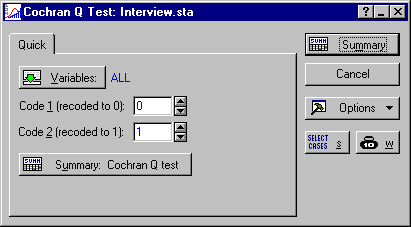 The Cochran Q test is an extension of McNemar's Chi-square test to more than two dependent samples. This test can also be considered to be an alternative to one-way within-subjects (repeated measures) analysis of variance (see the ANOVA and GLM modules) when the dependent variable is dichotomous in nature. This test is also applicable when you want to test changes in proportions at different times in the same sample. For a discussion of the logic and assumptions of this test, see Nonparametric Statistics Notes - Cochran Q Test.