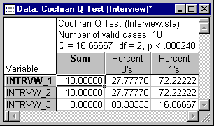 The Q test is highly significant. The right-most column shows the percent of households that disclosed personal information (Percent 1's). Interestingly, there is no difference in the effectiveness of the interested, enthusiastic style (Variable Intrvw_1) and the formal, courteous style (Intrvw_2), so interviewer interest does not seems to matter. However, refusals increased when the interviewer acted disinterested and abrupt (Intrvw_3).