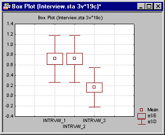 A quick visual summary of these results can be obtained by producing a box plot. Select Box Plots from the Graphs - 2D Graphs menu to display the 2D Box Plots dialog. On the Quick tab, click the Variables button to display the standard variable selection dialog. Here, select all three variables as the Dependent variable and then click the OK button to return to the Quick tab. Next, select Multiple as the Graph Type, and in the Middle point group box, select Mean in the Value box. Note that when you do this, the preview graph on the Quick tab changes so you can see that you will be producing a Mean/SE/SD box plot. Then, click on the Advanced tab, and in the Outliers group box, select Off. Finally, click the OK button in the 2D Box Plots dialog to produce the following plot.