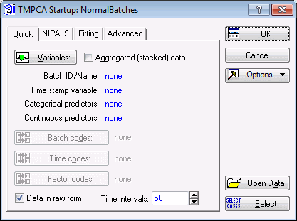 In the variable selection dialog box, click the OK button to accept the variable selections, close the dialog box, and return to the TMPCA Startup dialog box.