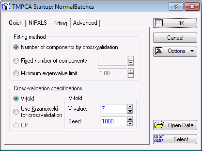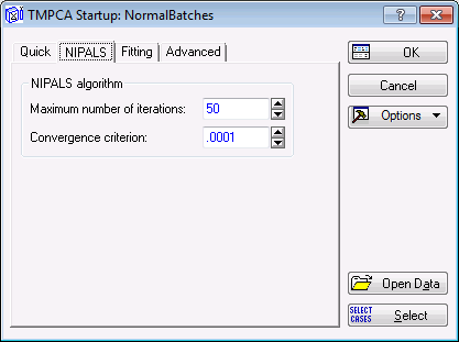 At this point you may want to check the analysis configuration, which is determined by the option settings on the Quick, NIPALS, Fitting, and Advanced tabs. These tabs provide various control settings that can be adjusted to suit your individual analysis.