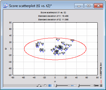 Further batch diagnostics can be carried out using the scatterplot of the t-scores. The t-scores are the transformed values of the process variables in the principal component system. A t-score with too high a value (i.e., one that deviates substantially from the point of origin) can be regarded as a sign of abnormality.