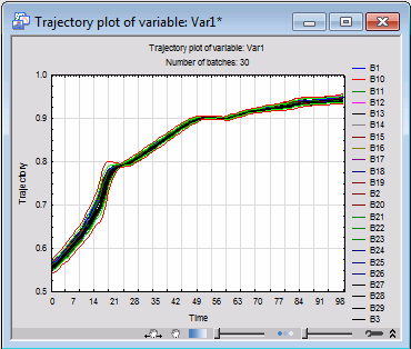 Finally, we can further analyze our batch model by examining the trajectory of its process variables. On the Advanced tab, select Var1 from the Trajectory drop-down menu, and click the Trajectory button with the graph icon: