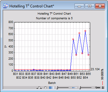 The next step is to check whether there are abnormal batches in the data set. Click the T2 Chart button to produce a T2 chart.