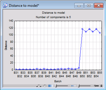 Next, click the D-To-Model button to generate a distance-to-model line plot for the batches in the data set. Again, we see that values of distance-to-model for B50 through B55 are unusually high, which suggests that they are very different from the normal batches, which have substantially smaller values of distance-to-model.
