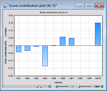 Another useful graph you can produce is the variable contributions to the scores of a principal component for a specific batch and time slot. Click the Contribution button with the graph icon:
