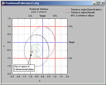 The Computational Details topic shows the formulas that can be used to compute process capability indices for processes with positional (circular) specifications such as this; these formulas have the same interpretation as do the standard univariate capability indices computed by the Process Analysis Procedures module, i.e., they can be interpreted as the number of times that the normally occurring process variability (in two-dimensional space) will "fit" inside the lower and upper specification limits.