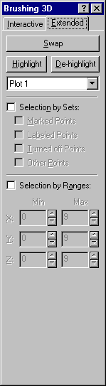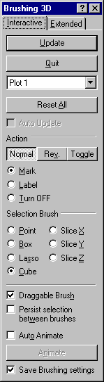button to activate the brushing mode and display the interactive Brushing dialog. When this mode is activated, the cursor changes to a "gunsight-style" cross-hair (several other brushes are also available, see the Brushing dialog). You can then highlight data points from the graph by clicking on them with the cross-hair (or enclosing them in the rectangle or lasso, or for 3D displays with a cube or a custom 3D slice).