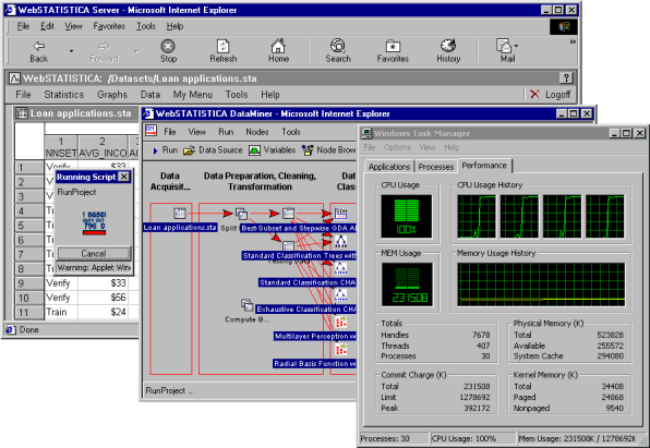 Many additional advantages are offered by the specific implementation of the client-server architecture in Statistica Data Miner, which is based on the Statistica Enterprise Server technology. The Statistica Enterprise Server platform is built on advanced distributed processing and multithreading technology to support optimal management of large computational loads. This technology enables rapid processing of even very large and computationally intensive projects, taking full advantage of the multiple CPUs on the server, or even multiple servers working in parallel. The illustration below shows a project running on a quad processor server, along with the server performance monitor, demonstrating the full utilization of the resources of all four CPUs executing in the multithreading mode a single, computationally intensive Statistica Data Miner project.