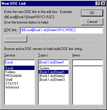 If you are unsure of the exact syntax for the link statement and you have the source file open, you can use the three frames at the bottom of the dialog, which act as active DDE servers, to help you build the appropriate link statement.