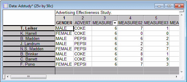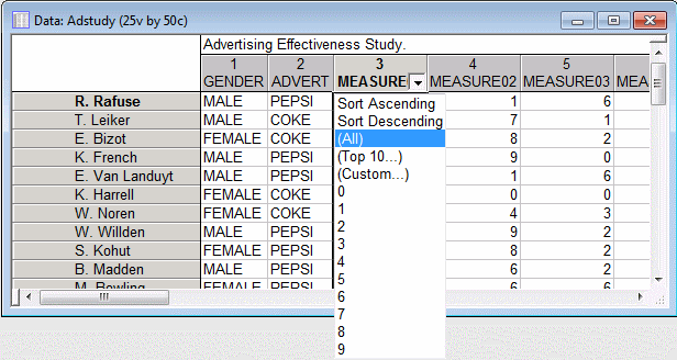| Sort Ascending/Descending | Select Sort Ascending or Sort Descending from the Auto Filter Criteria menu to sort the selected variable in the specified order. If the selected variable has text values, then the sort is based on the text values and not the underlying numeric values. Note that if a sort filter criteria is applied to more than one variable, the most recently filtered variable is consider the primary sort variable. For example, in the spreadsheet shown above, if you were to specify a Sort Ascending filter criteria for the variable Gender, the cases would be sorted with Females first. If you were then to specify a Sort Ascending filter criteria for Advert, Advert would be treated as the primary sort, and the sorted values for Gender would be nested within the sorted levels of the Advert variable, that is, Females who prefer Coke would be followed by Males who preferred Coke. Then, Females who prefer Pepsi would be followed by Males who prefer Pepsi. |