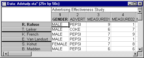spreadsheet selection conditions; that is, all rows - including cloaked ones - are used when running analyses. Also note that cloaked cases in a spreadsheet are indicated by black lines between uncloaked case names, as shown in the spreadsheet, below, where cases between T. Leiker and K. French are cloaked.