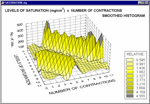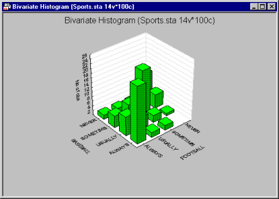 3D Bivariate Histograms provide information similar to crosstabulations. Although specific (numerical) frequency data are easier to read in a table, the overall shape and global descriptive characteristics of bivariate distributions may be easier to explore in a graph. Moreover, the graph provides qualitative information about the distribution that cannot be fully represented by any single index. For example, a bivariate skewed distribution of response latencies vs. the duration of a reaction-time task (in a reaction-time experiment) may result from the changes in subjects' strategies of dealing with fatigue.