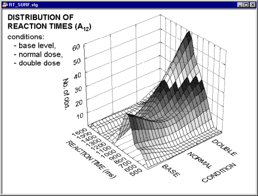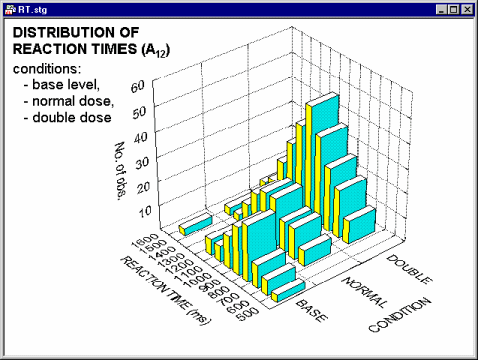 Specifically, in this graph the distribution of reaction times (a continuous variable categorized by dividing the entire range of values into 12 intervals of equal size) can be reviewed across three experimental conditions (a discrete variable with three distinctively labeled levels: BASE, NORMAL, and DOUBLE).