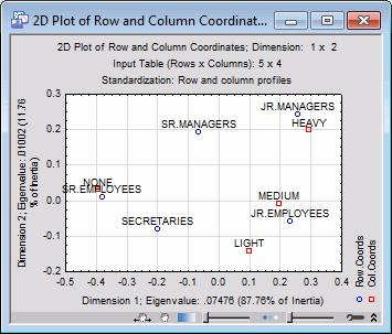 To reiterate, direct comparisons between row and column points are not meaningful. However, you can make meaningful interpretations of the general locations of row and column points, and their relations within each type of point. For example, if you review the 2D graph of the row and column points, you can see that the first (horizontal) dimension, which accounts for most of the inertia (and is, therefore, the most important dimension, explaining most of the differences between the patterns of relative frequencies in the rows of the table, and in the columns of the table), is characterized by None smokers on the left, and Light, Medium, and Heavy smokers to the right; the row points that are farthest to the left on this axis are the Senior Employees and Secretaries. This would suggest that much of the total inertia is due to the difference between non-smokers and smokers, and that there are relatively more non-smokers among Senior Employees and Secretaries.