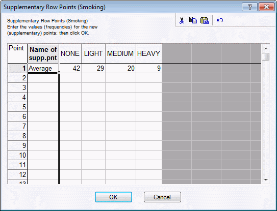 dialog is displayed where you can specify the supplementary row points. Remember that in row profile standardization, the analysis is performed on the relative row frequencies, which sums to 1.0; thus, it does not matter whether you enter 42 or .42, that is, percentages or proportions, the results will be the same either way. - To enter a supplementary row, first type a name or label for the row into the first column of the spreadsheet (example, type