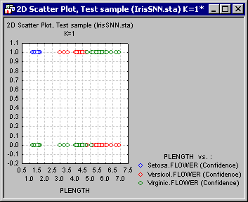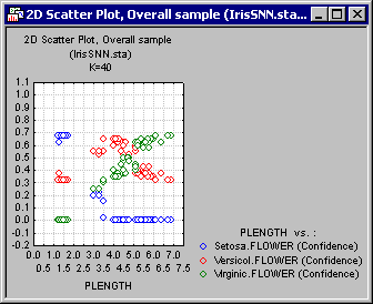 On the Plots tab, select the independent variable PLENGTH as the X-axis and the confidence levels for the class levels (as before). Click the Graph of X and Y button. Note that due to the larger value of K (as compared to the cross-validation estimate 3) predictions have already started to deteriorate. You can easily see this by noticing the larger region of overlap between the class levels.