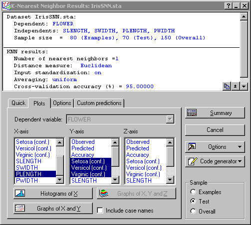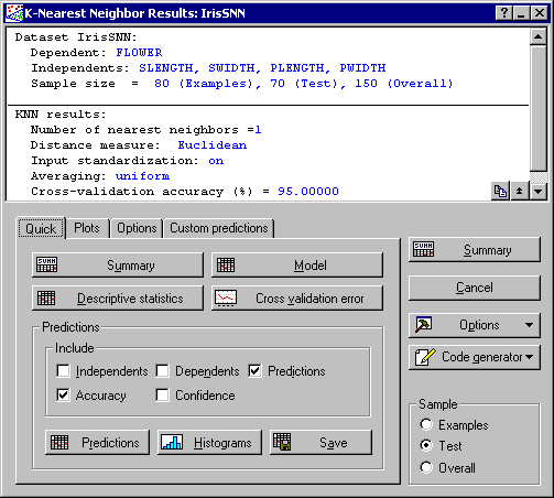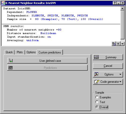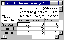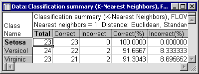 In the Summary box at the top of the Results dialog, you can see some of the specifications of your KNN analysis, including the list of variables selected for the analysis and the size of Example, Test, and Overall samples (when applicable). Displayed also are the number of nearest neighbors, distance measure, and whether input standardization and weighting based on distance are in use. You can also review the cross-validation error. Note that these are the specifications made on the K-Nearest Neighbors dialog.