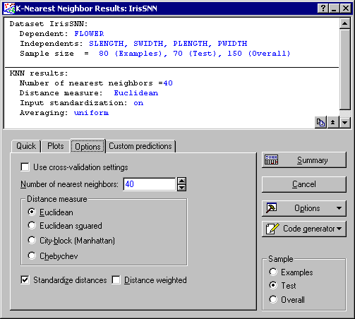 Since there is no model fitting in a KNN analysis, the results you can produce from the Results dialog are by no means restricted to the specifications made on the K-nearest neighbors dialog. To demonstrate this, select the Options tab of the Results dialog, and clear the Use cross-validation settings check box. This will enable the rest of the controls on this tab, which are otherwise unavailable. (Note: This action will not discard the cross-validation results. You can always re-set your analysis to this setting by selecting the check box again). Change the number of nearest neighbors to 40.