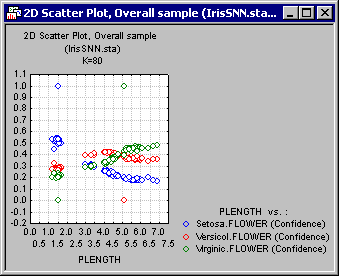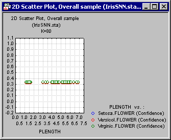 Next, we'll study the effect of distance weighting on KNN predictions. Select the Options tab once again, and select the Distance weighted check box. Leave K at 80 and produce the graph of PLENGTH against the confidence levels once more. Despite the fact that all cases from the examples sample are included, there is significantly less overlap between the class levels. This implies a more correct classification is possible despite the inclusion of all cases belonging to the examples sample.