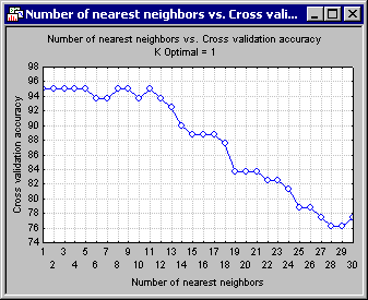 The first thing you should look for in this graph is the existence of a saddle point, i.e., a value of K with maximum classification accuracy compared to its neighboring points. The existence of a maximum indicates that the search range for K was sufficiently wide to include the optimal (from a cross-validation sense) value. If it is not present, return to the KNN dialog by clicking the Cancel button on the Results dialog, and increase the search range.