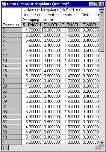 As discussed before, Statistica KNN makes predictions on the basis of a subset known as examples (or instances). Click the Model button to create a spreadsheet containing the case values for this particular sample.