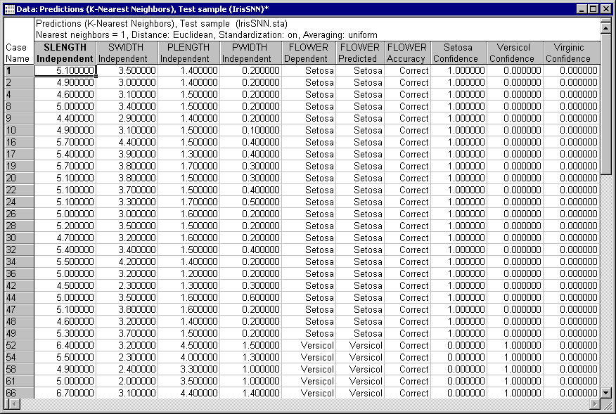 For example, shown above is a scatterplot of the independent variable PLENGTH against the confidence level of the categorical levels Setosa, Versicol, and Virginic. From the displayed (relative) values, it is clear that Setosa is well separated, while some degree of overlapping exists between Versicol and Virginic. This overlap accounts for the misclassified cases, which you can view from the predictions spreadsheet (see below). To produce the graph shown, in the K-Nearest Neighbors Results dialog, select the Test option button in the Sample group box, select PLENGTH from the X-axis list and Setosa (conf.), Versicol (conf.), and Virginic (conf.) from the Y-axis list. Then click the Graphs of X and Y button.