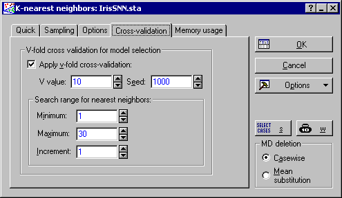 Finally, select the Cross-validation tab. Select the Apply v-fold cross-validation check box; in the Search range for nearest neighbors group box, enter 30 in the Maximum field (to increase the maximum number of nearest neighbors K to 30).