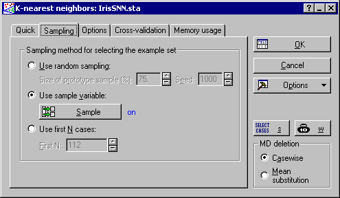 One important setting to consider is the sampling technique for dividing the data into examples and testing samples (on the Sampling tab). Although the choice of a sampling variable is not the default setting (as a sampling variable may not be available in your data set) you may want to use this option since it divides the data deterministically, unlike random sampling, which allows an easier comparison of results obtained with different experimental settings, i.e., choice of K, distance measure, etc.