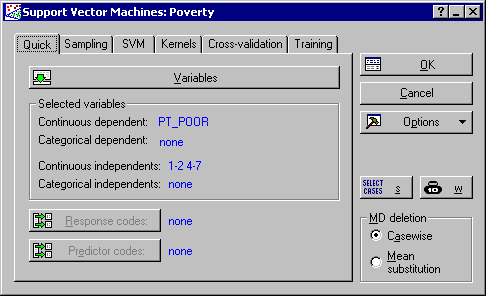 One thing you may have noticed by now is the difference between the typical values of the independent variables. This may be counter productive when constructing a good SVM regression model. To alleviate this problem you may want to rescale your variables to lay in the range 0 to 1. This will ensure that all variables are treated on the same scale. To do this, display the Training tab and select the Scale continuous independent variable(s) and Scale continuous dependent variable check boxes.