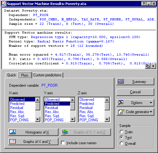 In the Summary box at the top of the Results dialog are specifications of the SVM model, including the number of support vectors and their types, and the kernels and their parameter(s). Also displayed are other specifications made in the Support Vector Machines dialog, shown here for your reference, including the dependent and independent variable list, and the value of the training constants (capacity, epsilon, and nu). Also listed are the cross-validation results (when applicable) as well as regression statistics for training, test, and overall samples such as mean error squared, standard deviation ratio, and correlation coefficients.