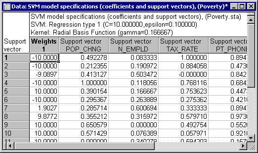 Statistica SVM constructs the regression function through a set of support vectors and coefficients. On the Quick tab, click the Model button to display the spreadsheets of these quantities. This can be useful for a detailed review of the SVM model or for inclusion in reports.