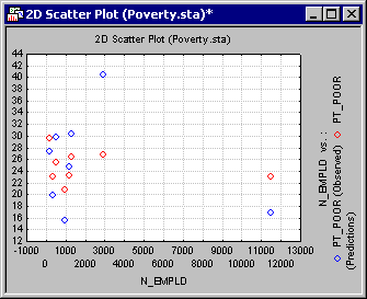 For example, shown above is a scatterplot of the predicted and observed values plotted against the values in variable N_EMPLD. In general, this type of plot will provide an effective way of comparing model predictions with the observed data. To produce the graph shown above, select N_EMPLD from the X-axis list and Observed and Predicted from the Y-axis list. Then click the Graphs of X and Y button.