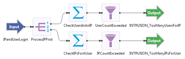 When you have successfully created the arc, a solid black line is shown between the components, and components downstream may change color to indicate their new typecheck status. The figure below shows eight connected components: an input stream, a Split operator, two Map operators, two Filter operators, and two output streams.