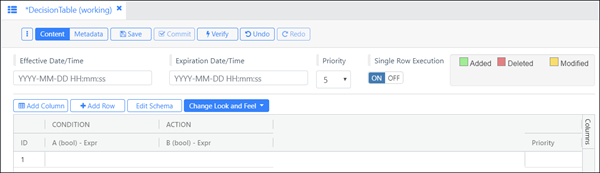 With your artifact displayed in the Artifact Editor, click , one column for each condition or action you want to build into your business rules.