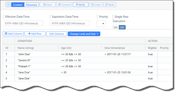 Enter your rule information into each cell as required, depending on the column's data type. See Decision Table Syntax for Building Rules for syntax guidance. If using the boolean data type, double-click in the cell to toggle between true and false.