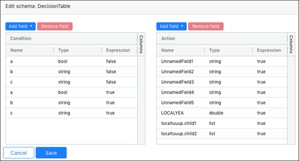 The schema editor offers a streamlined and often more efficient method for editing artifact rules. From the schema editor, you can manage fields (condition and action columns) and build rules using rules syntax as required.