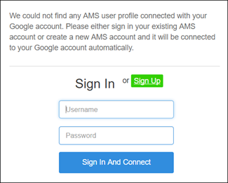 If your OIDC identity is already bound to an AMS user account, the sign-in takes you directly to the AMS web client. Otherwise, depending up the AMS server configuration, you are prompted to sign in to an existing AMS account or enter the username and password of a new AMS user account to create, as shown in the following Sign In or Sign Up dialog.