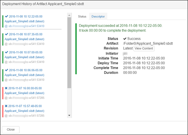 To view the history, right-click a deployed artifact and select > . The following example shows six deployment records for an artifact named Applicant_Simple0.sbdt, including a description for each.