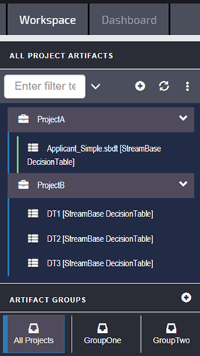 Refresh button: Refreshes the Workspace view for changes to projects, groups, or artifacts