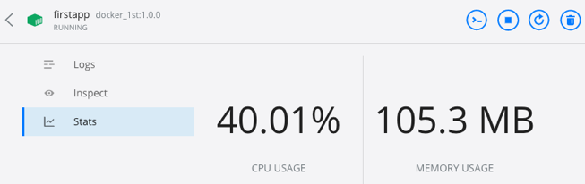 docker pscommand, which returns a row like the following:CONTAINER ID IMAGE COMMAND CREATED STATUS PORTS NAMES 460ab35a4036 docker_1st:1.0.0 "/bin/sh -c ${STREAM…" 4 minutes ago Up 4 minutes firstapp -
