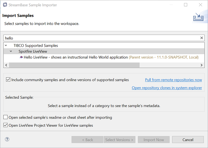 In the search field for the StreamBase Sample Importer dialog, type